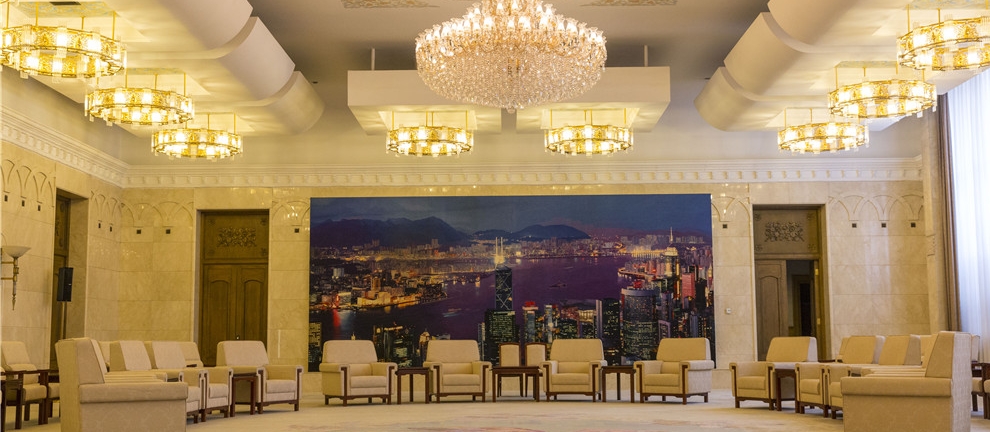 香港厅总面积1 728平方米,是人民大会堂内以地区名命的面积最大的厅室。香港厅分主会议厅和多功能厅两部分,另有小休息厅、厨房、卫生间、室外花园等配套设施。主会议厅建筑面积700多平方米,墙面和地板以西班牙浅米黄大理石镶贴。主会议厅的主照明由顶部悬挂着的三套特制水晶灯提供。水晶灯的造型端庄华丽,来自奥地利的施华洛斯奇水晶熠熠生辉。周边吊顶的环形灯同样是特别设计制作的,与主吊灯起将香港厅装饰得富丽堂皇。